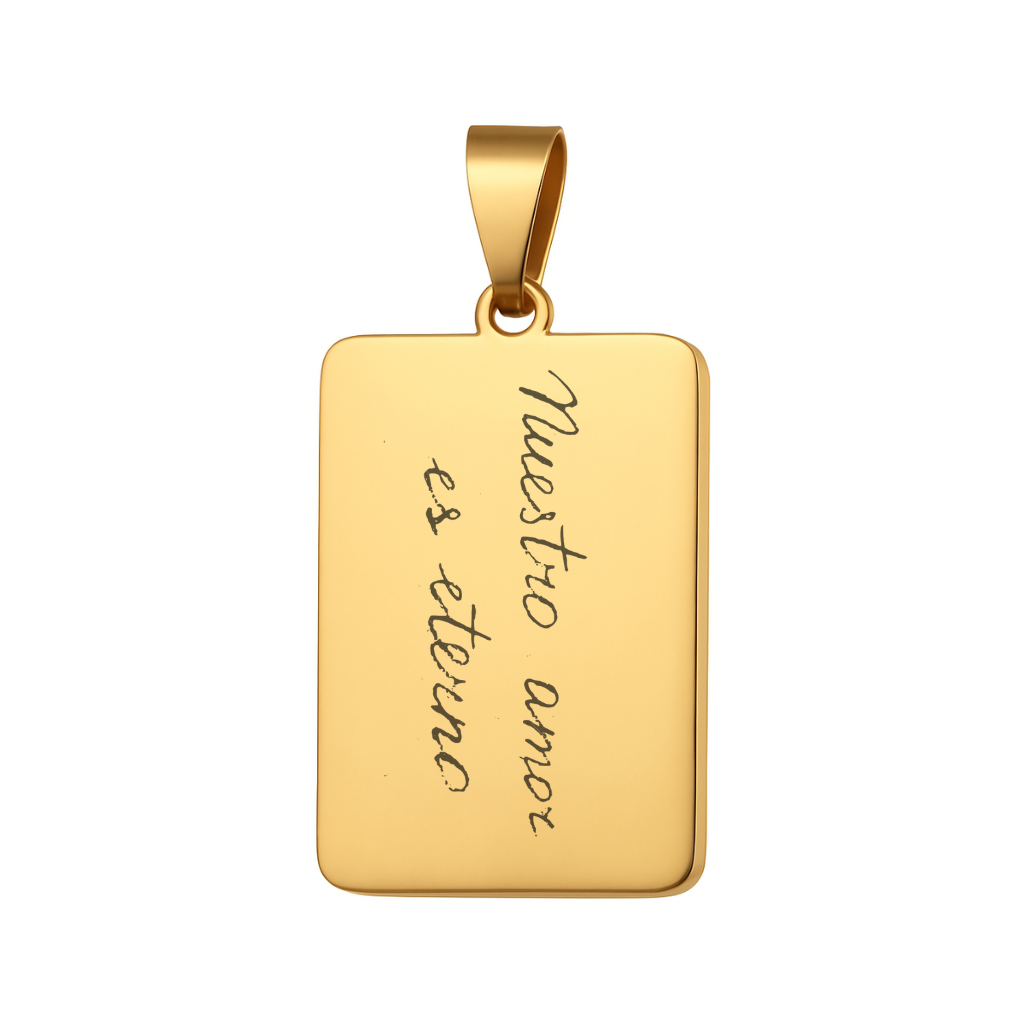 Este colgante de acero inoxidable con forma rectangular es el detalle perfecto para llevar tus palabras favoritas siempre contigo o sorprender a alguien especial con un regalo lleno de significado ahora con tu propia letra
