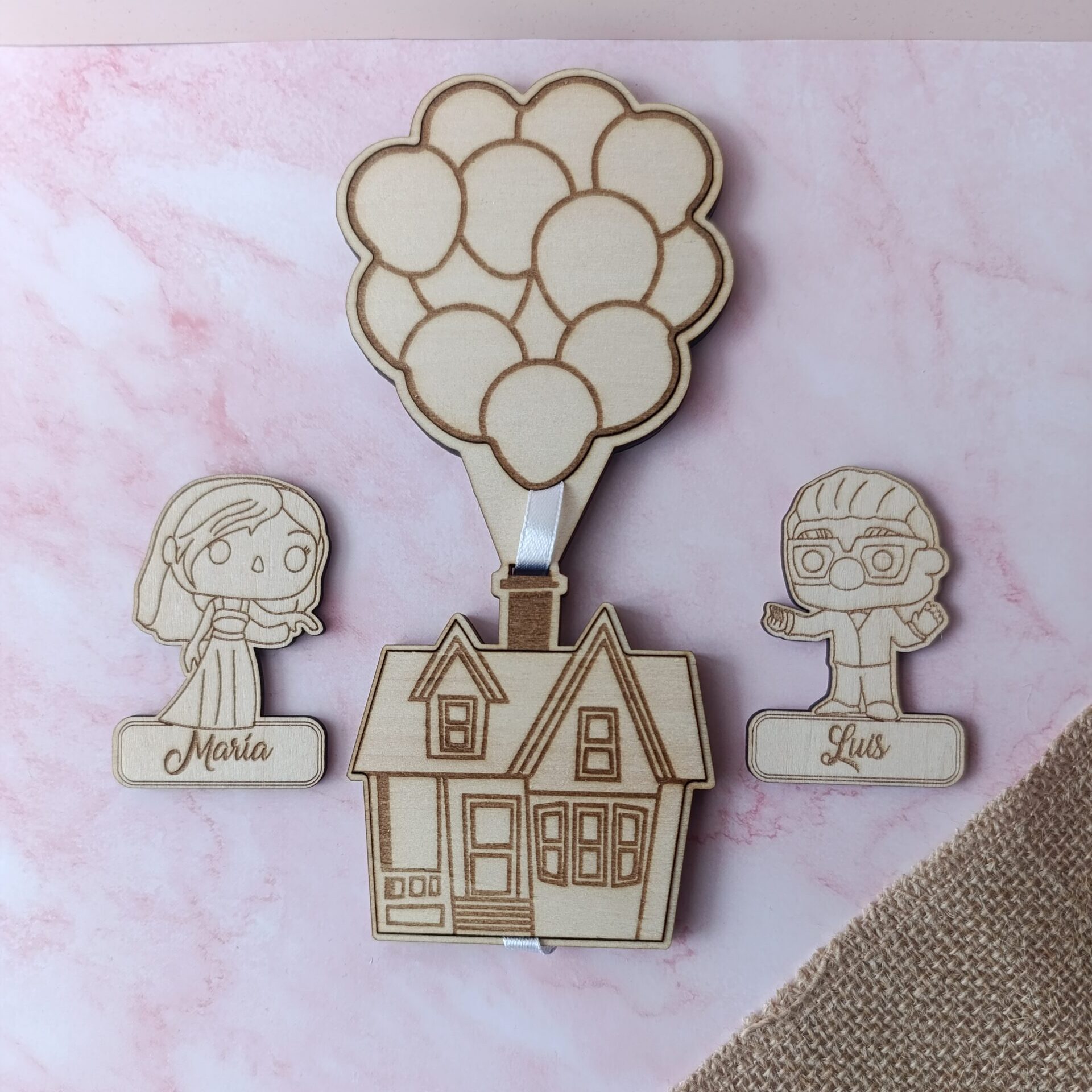 Perfecto para parejas soñadoras, aventureras y románticas, este pack de boda UP está elaborado en madera natural grabada y pintada a mano, cuidando cada detalle para que tus invitados se lleven un recuerdo único y lleno de color.
