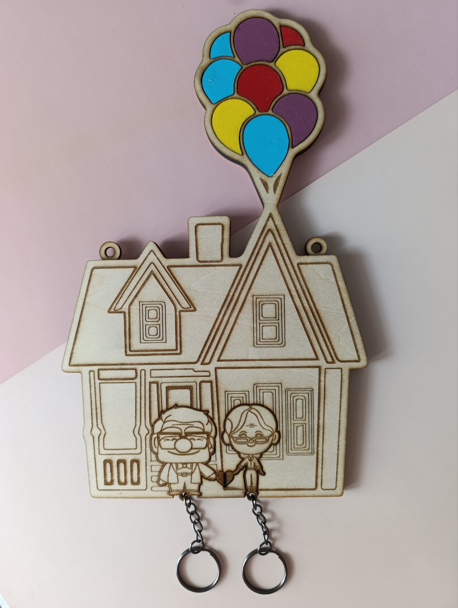 El cuelgallaves “UP” está diseñado y fabricado en nuestro taller con madera natural grabada a láser, y pintado a mano con tonos vivos que evocan ilusión y calidez.