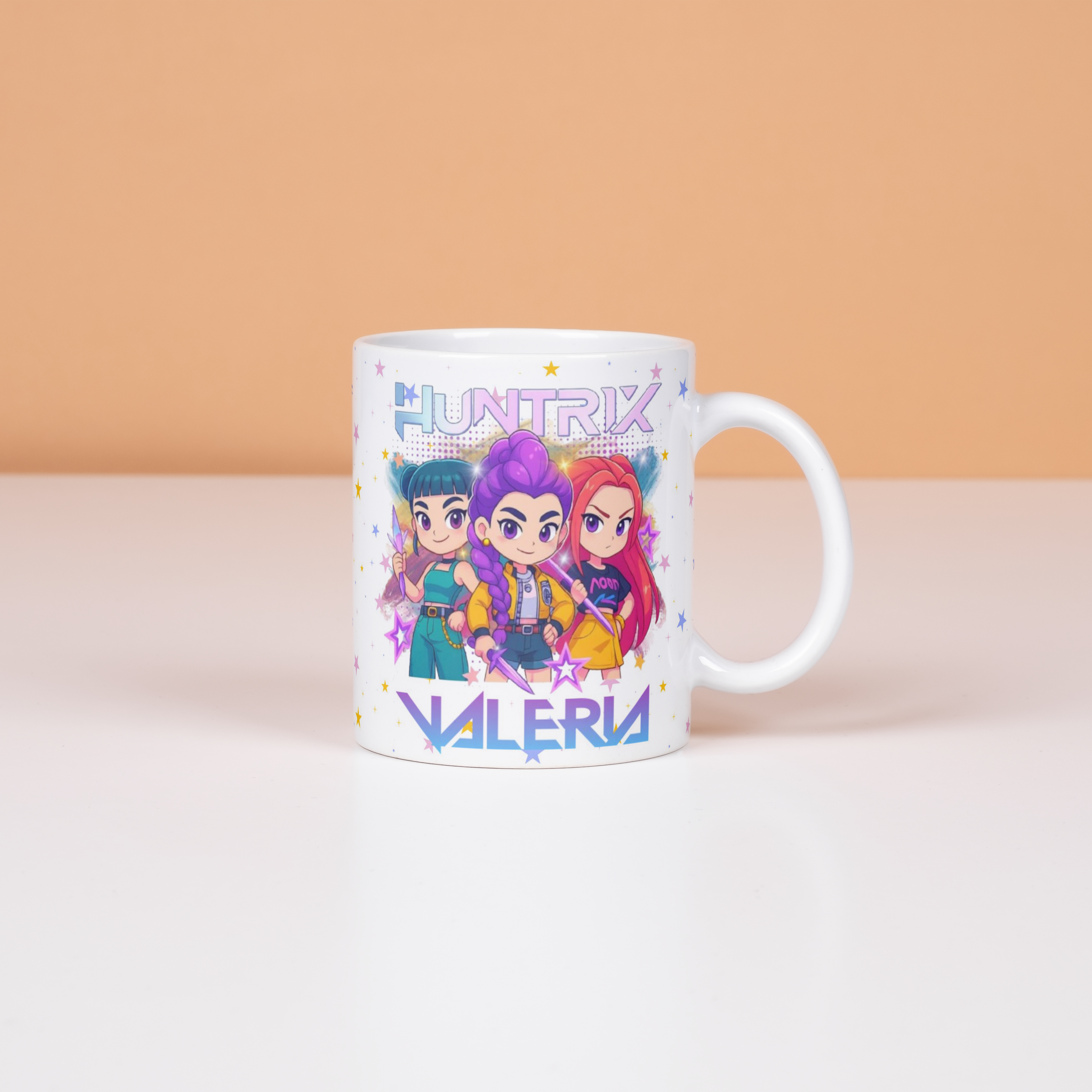 Esta taza de cerámica de alta calidad está inspirada en las Huntrix, las heroínas más brillantes del universo K-pop. Con un diseño colorido y lleno de energía, es el regalo perfecto para fans que quieren un toque único en su día a día.